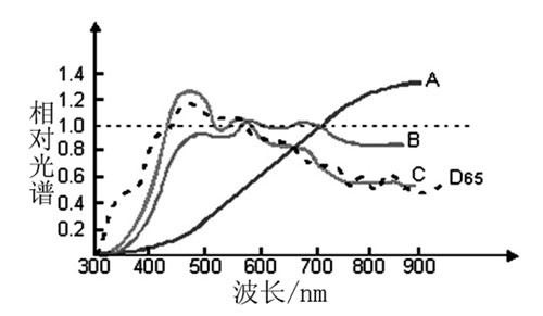 為了統一測量標準,CIE推薦過標準光源A、B、C、D65,下圖為A、B、C、D65光源的光譜分布圖,下表為A、B、C、D65光源的描述。