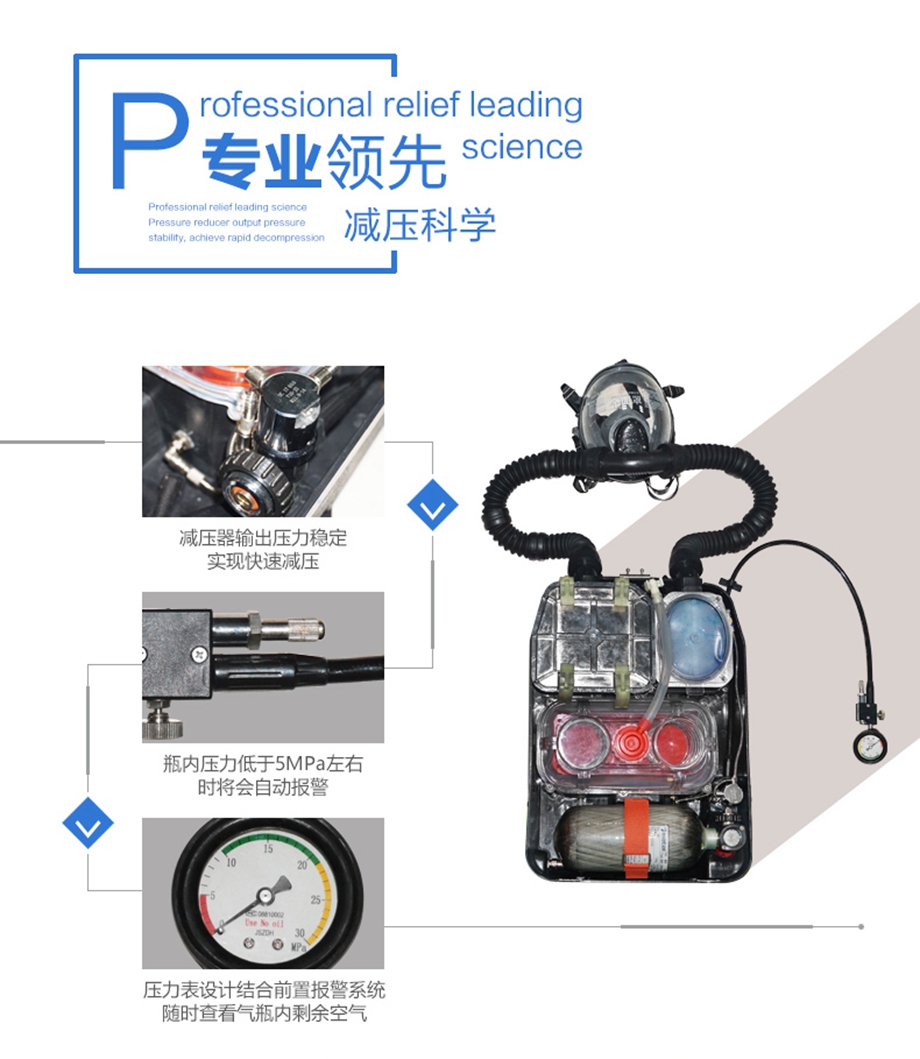 隔絕式正壓氧氣呼吸器,是以碳纖維氣瓶承載壓縮氧氣為起源的氣密式循環(huán)供人體呼吸及保護的裝置,能給佩戴的作業(yè)人員提供大于2小時的內(nèi)部循環(huán)氧氣供應,能完全的隔絕外界環(huán)境空氣,起到絕對的呼吸保護作用。